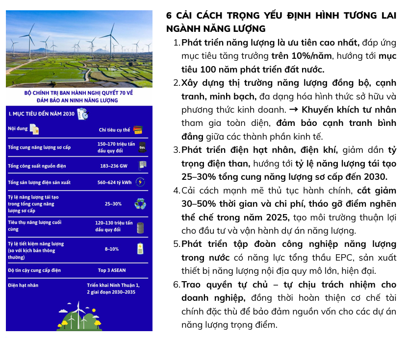 đất nước - Nghị Quyết 70 ra đời Mục tiêu bảo đảm vững chắc an ninh năng lượng quốc gia; phát triển ngành năng lượng hài hòa,đồng bộ, hiện đại, đạt trình độ tiên tiến khu vực; xây dựng thị trường năng lượng cạnh tranh, minh bạch, nâng cao tỷ lệ nội địa hóa và thu hút khu vực tư nhân.