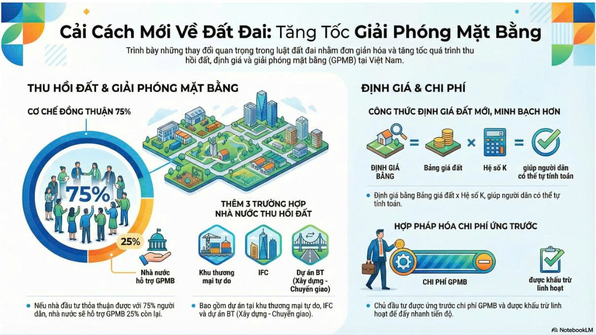 Nghị quyết mới của Quốc hội về cải cách đất đai đang tạo ra một điểm đột phá rất lớn cho bất động sản, khi lần đầu tiên đặt trọng tâm vào việc tăng tốc giải phóng mặt bằng bằng cơ chế đồng thuận 75%. Chỉ cần đạt được sự đồng ý của đa số người dân, Nhà nước sẽ đứng ra hỗ trợ thu hồi phần còn lại, thay vì để dự án “kẹt cứng” vì vài hộ không thỏa thuận được như trước. Cùng với đó, phạm vi Nhà nước được thu hồi đất được mở rộng thêm cho các dự án tại khu thương mại tự do, IFC hay dự án BT – những mảng vốn là nút thắt kéo dài của thị trường. Điều này giúp rút ngắn đáng kể thời gian chuẩn bị quỹ đất, giảm rủi ro pháp lý và giải phóng nguồn cung bị dồn nén suốt nhiều năm.