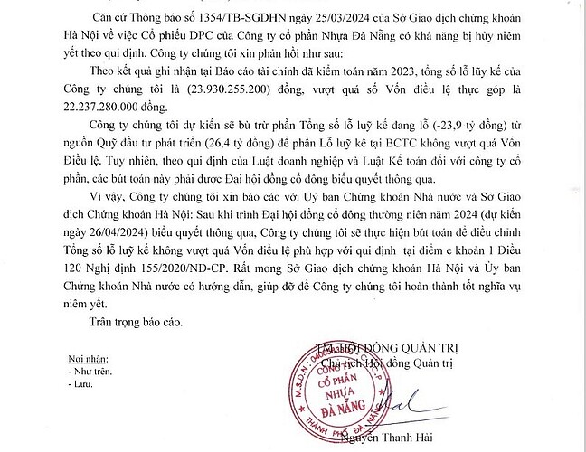 “Sau khi trình ĐHCĐ thường niên 2024 biểu quyết thông qua, chúng tôi sẽ thực hiện bút toán để điều chỉnh tổng số lỗ lũy kế không vượt quá vốn điều lệ phù hợp với quy định. Rất mong Sở Giao dịch Chứng khoán Hà Nội, Ủy ban Chứng khoán Nhà nước có hướng dẫn, giúp đỡ để công ty chúng tôi hoàn thành tốt nghĩa vụ niêm yết”, Nhựa Đà Nẵng khẩn thiết.