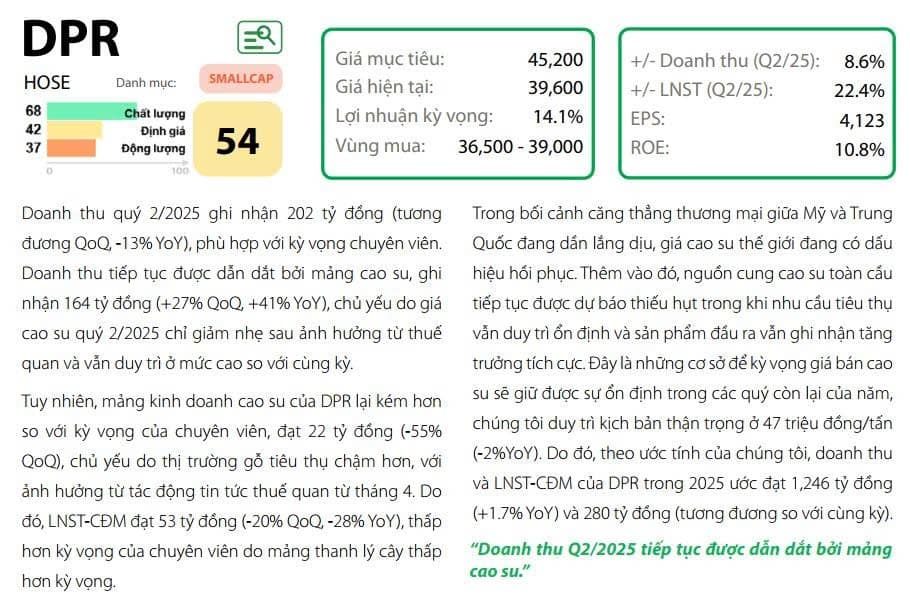 Kết quả kinh doanh của DPR trong năm 2025 được dự báo sẽ tăng trưởng nhờ vào xu hướng ổn định của giá cao su. Trong kịch bản cơ sở, doanh thu và lợi nhuận sau thuế của DPR có thể đạt khoảng 1.208 tỷ đồng, tăng 12,4% so với năm trước, và 295 tỷ đồng, tăng 8% so với năm trước. Dự báo này dựa trên các giả định rằng giá cao su sẽ vẫn ổn định do nguồn cung thiếu hụt, mảng thanh lý cây sẽ mang lại lợi nhuận ổn định, và DPR sẽ nhận được tiền đền bù từ dự án Tiến Hưng 1.