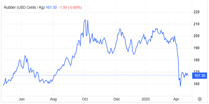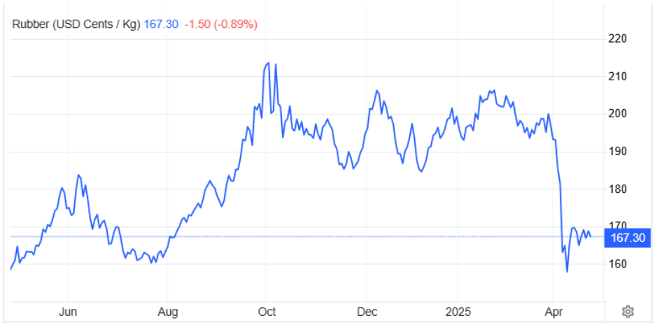 Hình 4: Giá cao su 1 năm trở lại đây. Hiện tại, giá cao su sau khi đạt đỉnh đã quay về vùng giá chỉ ở mức 167 USD/kg. Tuy nhiên, Q1 lại không phải thời điểm công ty tích trữ cao su, nên biên lãi gộp vẫn sẽ bị ảnh hưởng trong ít nhất Q2/25.