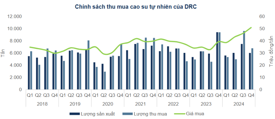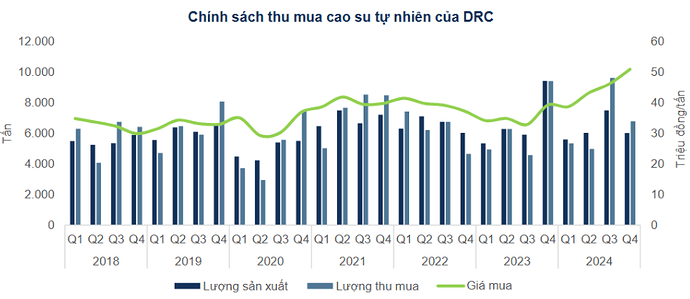 Theo dự báo, năm 2025 sẽ tiếp tục chứng kiến sự leo thang của giá cao su tự nhiên, khi mà tình trạng thiếu hụt nguồn cung sẽ còn tiếp diễn. Theo ANRPC, tình trạng này sẽ còn kéo dài tới năm 2028, khi mức thiếu hụt hàng năm có thể lên tới 600.000 – 800.000 tấn. Vì thế, chúng tôi cho rằng biên lãi gộp của DRC sẽ khó duy trì ở mức cao (từ 15-17%) như giai đoạn trước đây, nhất là khi sản phẩm đầu ra cũng đang gặp nhiều cạnh tranh về giá bán.