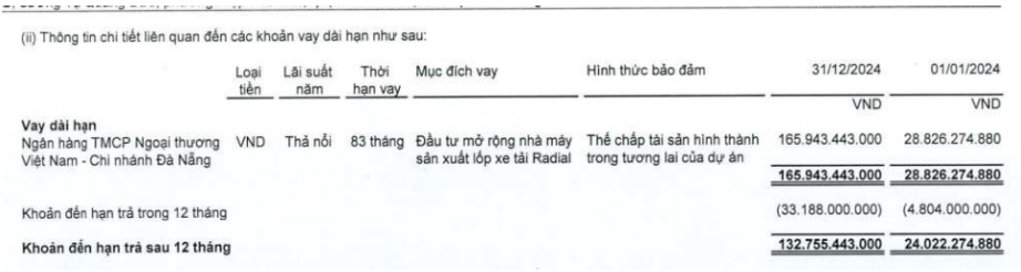 Ngoài ra, công ty phải vay nợ thêm khoảng 150 tỷ đồng (tính theo báo cáo Q1/25) để chi trả cho dự án này. Báo cáo thuyết minh cuối 2024 cũng cho thấy, khoản vay này có lãi suất thả nổi, thời hạn vay là 83 tháng - tương đương khoảng 7 năm. (Hình 6)