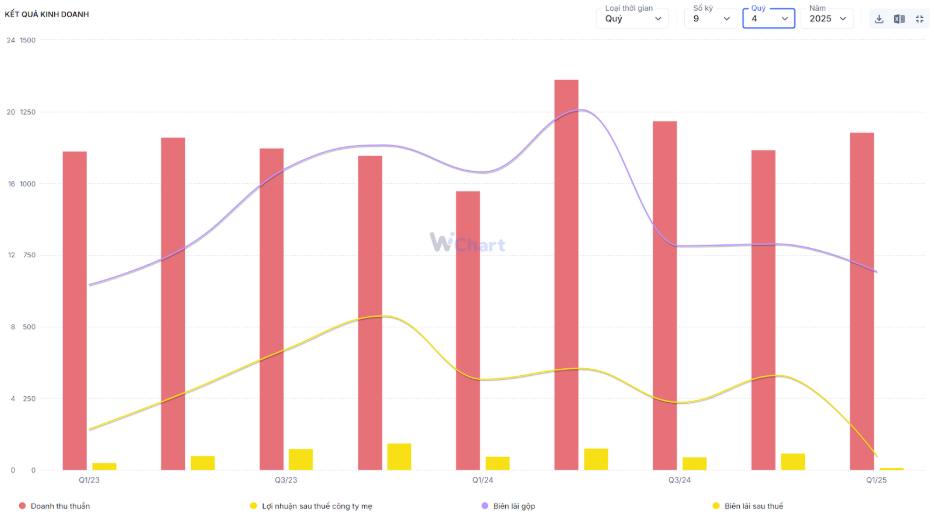 Tại thời điểm Q1/25, chúng tôi thấy nợ ngắn hạn lên tới 930 tỷ đồng (+12% so với đầu năm), trong khi nợ dài hạn tăng 11% so với đầu năm, đạt 146 tỷ đồng. Với con số này, chúng tôi cho rằng chi phí lãi vay sẽ tăng lên khoảng 11-12 tỷ đồng, trong khi doanh thu tài chính sẽ tiếp tục giảm do lượng tiền và đầu tư tài chính ngắn hạn tại Q1 ở mức thấp nhất trong nhiều năm trở lại đây, dự báo ở mức khoảng 4-5 tỷ đồng.
