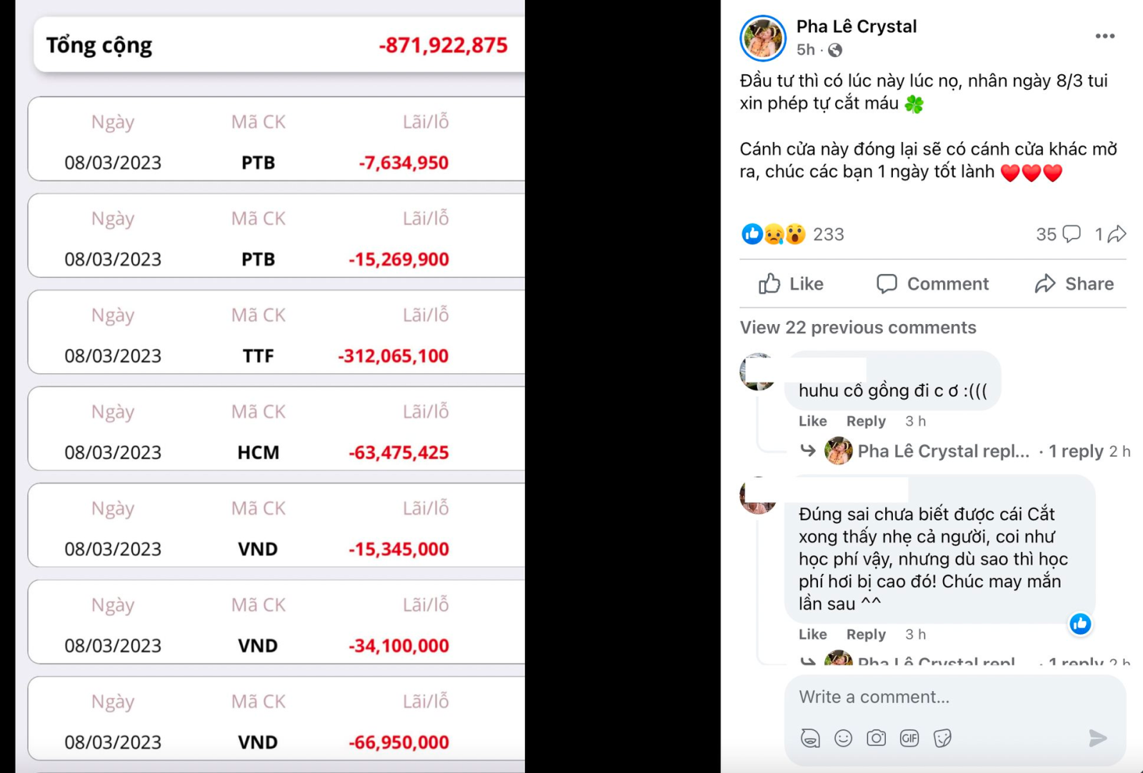 Mới đây, trên trang Facebook cá nhân Pha Lê Crystal, nữ ca sỹ Pha Lê vừa chia sẻ về việc “cắt lỗ” cổ phiếu với tổng số tiền lên tới 871,9 triệu đồng ngay trong ngày Quốc tế Phụ nữ 8/3.
