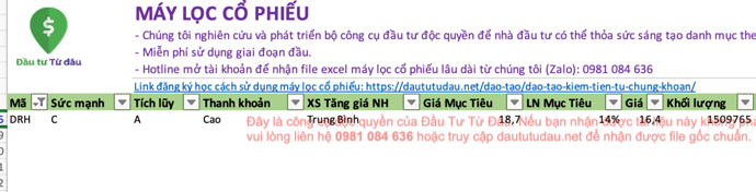 E sử dụng tool máy lọc cổ phiếu để xem các tiêu chí của DRH. Các bác có thể tự tạo danh mục các mã theo khẩu vị rủi ro dựa trên 20 tiêu chí: Máy lọc cổ phiếu - ĐẦU TƯ TỪ ĐÂU