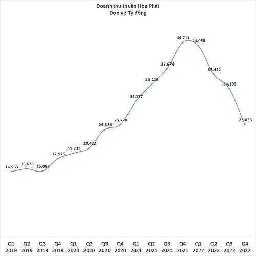 Riêng tại Hòa Phát, doanh thu công ty đã giảm 4 quý liên tiếp, xuống 25.800 tỷ đồng quý 4/2022. Lỗ sau thuế là gần 2.000 tỷ đồng, khiến kết quả cả năm của Hòa Phát chỉ còn lãi 8.400 tỷ đồng, giảm 75% so với năm trước.