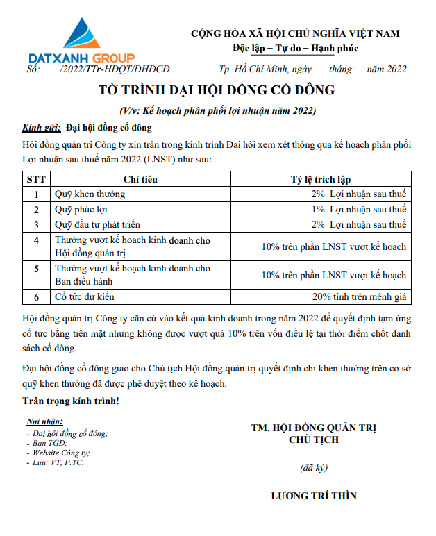 DXG công bố tài liệu ĐHCĐ năm 2022: Kế hoạch chia cổ tức năm 2022 dự kiến 20%, hủy kế hoạch phát hành riêng lẻ (năm 2021 đã công bố hủy). Nhiều AE sợ DXG in thêm giấy (PHRL) thì đã yên tâm rồi nhé.