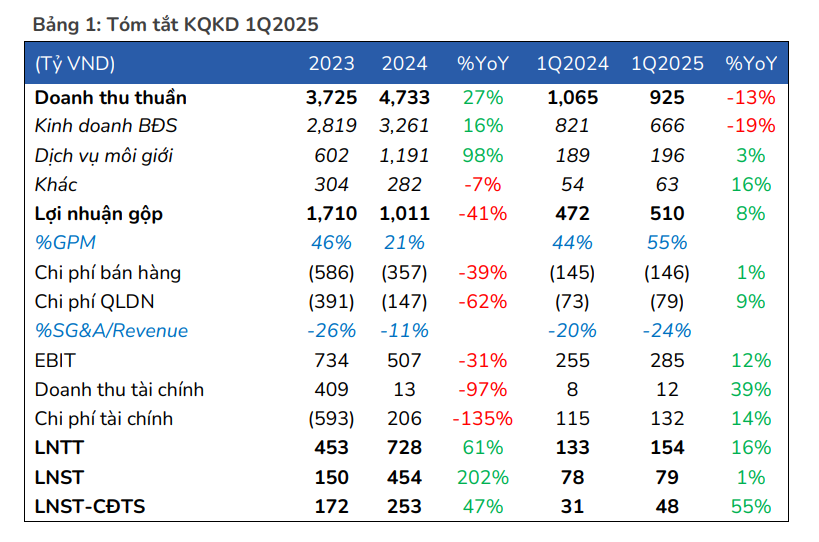 Trong 1Q2025, DTT = 925 tỷ VND (-13% YoY) và LNST-CĐTS = 48 tỷ VND (+55% YoY). Trong đó: