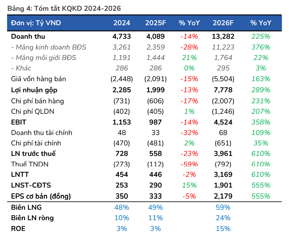 Kỳ vọng điểm rơi lợi nhuận từ bàn giao The Prive sẽ bắt đầu từ năm 2026, dẫn dắt mức tăng trưởng lợi nhuận ròng đạt LNST-CĐTS 2026 = 1,901 tỷ VND (+555% YoY).