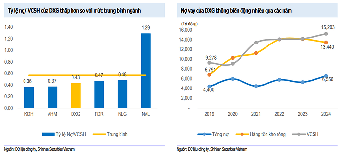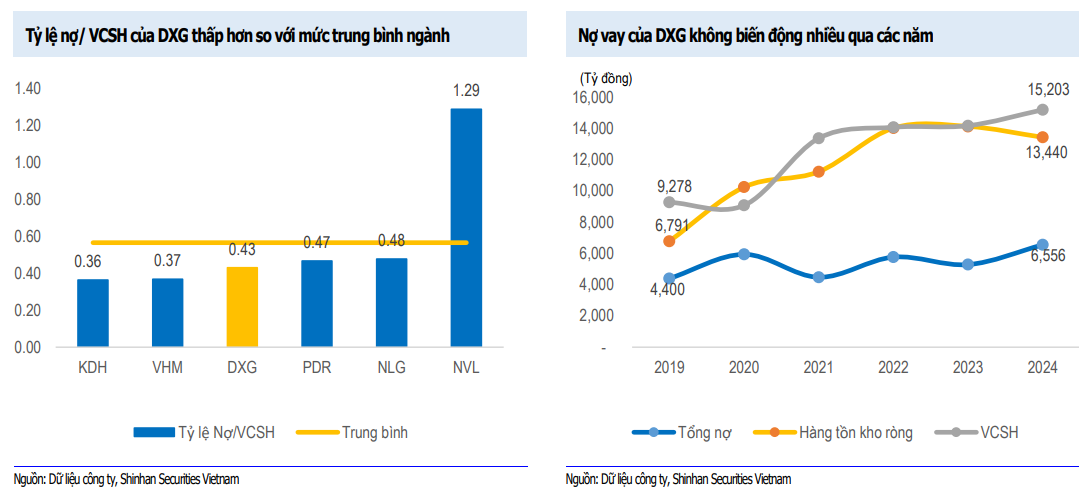 DXG cũng duy trì cơ cấu tài chính thận trọng với tỷ lệ nợ ròng trên vốn chủ sở hữu (D/E) ở mức 0,43x – thấp hơn đáng kể so với mức trung bình toàn ngành khoảng 0,57x trong bối cảnh nhiều doanh nghiệp trong ngành còn đang xoay xở tái cấu trúc nợ và thanh khoản. Lợi thế này giúp DXG có dư địa tài chính lớn hơn để triển khai dự án mới, tránh áp lực chi phí vốn và đón đầu chu kỳ phục hồi với vị thế chủ động.
