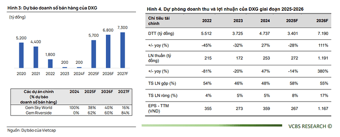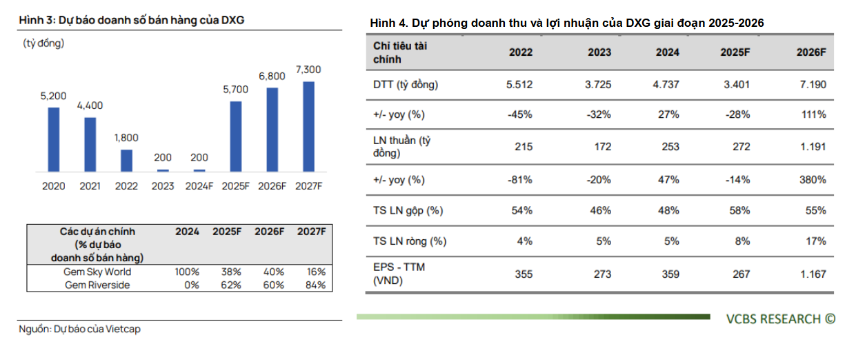 Ngoài ra, Gem Sky World (GSW) – một trong những dự án trọng điểm khác của DXG cũng đang bước vào giai đoạn hoàn thiện và dự kiến sẽ mở bán từ năm 2025 với khoảng 1.600 sản phẩm. Đây sẽ là chất xúc tác đi kèm bên cạnh The Privé trong hành trình hiện thực hóa mục tiêu vốn hóa tỷ USD của DXG . Gem Sky World kỳ vọng sẽ hỗ trợ kết quả kinh doanh năm 2025 cho DXG khi dự kiến sẽ ghi nhận doanh thu cho khoảng 300- 400 lô đất nền trên tổng số 800 lô đã bán tại phân khu Sapphire Parkview trong năm 2025 trong khi The Privé chưa ghi nhận doanh thu trong năm nay. Ước tính, tổng giá trị kí bán năm 2025 đạt 8,768 tỷ đồng (năm 2024 không có dự án mở bán) từ hai dự án The Privé và GSW: