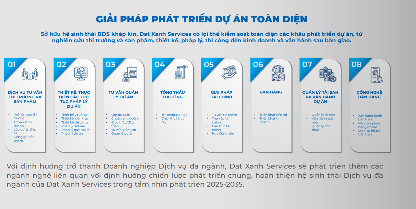 DXG sở hữu hệ sinh thái khép kín độc đáo, từ phát triển, môi giới (qua DXS), phân phối đến hậu mãi, giúp duy trì lợi thế cạnh tranh vượt trội. Nhờ đội ngũ môi giới hùng hậu hơn 15.000 chuyên viên kinh doanh và cộng tác viên: xem tại đây Dat Xanh Services Nhà phát triển dự án - cung cấp giải pháp phát triển dự án toàn diện người và ứng dụng công nghệ Proptech (cho phép xử lý giao dịch quy mô lớn, mở rộng sang thị trường thứ cấp), DXS tiếp tục giữ vị thế số 1 trong môi giới sơ cấp và nâng cao năng lực thích ứng với yêu cầu thị trường ngày càng cao.