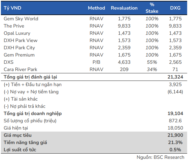 Đặc biệt, Dự án The Privé chiếm đến 51% tổng định giá của DXG của BSC đang được kỳ vọng sẽ là yếu tố chính giúp cổ phiếu được tái định giá ở mức cao hơn nếu giá bán và tốc độ hấp thụ vượt kỳ vọng. Mức giá tiềm năng của các công ty chứng khoán khuyến nghị MUA cho DXG đó là 21.900 VND/CP, tiệm cận mức giá 22.000 VNĐ/CP sau khi doanh nghiệp hoàn tất phát hành cổ phiếu trong quý 1/2025.