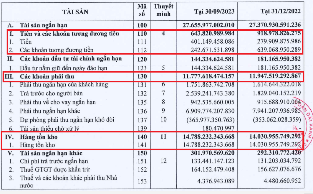 Tổng tài sản của DXG hơn 30k tỷ nhìn chung thì k có biến động nhiều so với đầu năm, chủ yếu là TSNH tới 27.600 tỷ chiếm tới 90% TTS. Khoản Tiền và tương đương tiền giảm 30% so với đầu năm chứng tỏ dòng tiền lưu động yếu hơn, tuy nhiên nhìn nhận so với quý 2/2023 thì khoản tiền đã có sự tăng trưởng trở lại rồi. Doanh nghiệp nào thì cũng cần có một lượng tiền vừa phải để đáp ứng hđ thường ngày như chỉ trả lương, thuế hay là mua nguyên vật liệu, mình đánh giá lượng tiền bao gồm cả đầu tư nắm giữ đến ngày đáo hạn gần 800 tỷ như này là ở mức khá ổn