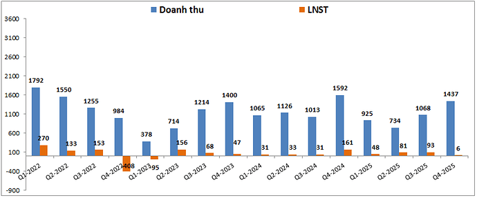 Trước tiên chúng ta cũng sẽ cập nhật nhanh KQKD Q4 và cả năm 2025 của DXG để xem lại tình trạng doanh nghiệp trong thời gian vừa qua. Kết thúc Q4-2025 DXG ghi nhận doanh thu thuần đạt 1,437 tỷ đồng, giảm 9.7% yoy. Đáng chú ý lợi nhuận sau thuế chỉ ghi nhận 6 tỷ đồng dù cho lợi nhuận gộp đạt tận 840 tỷ đồng, tăng 6.5% yoy nhờ biên lợi nhuận gộp tốt hơn so với cùng kỳ. (Hình 1)