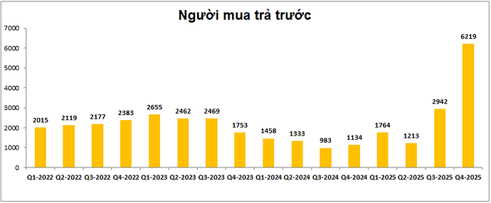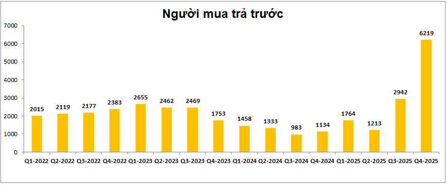 - The Privé: Dự án đã gây ấn tượng lớn khi mở bán đợt đầu vào tháng 8-2025 khi hấp thụ hết 1,024 căn hộ chỉ sau vài tiếng mở bán. Giá bán bình quân quanh 125-130 triệu/m². Công ty sau đó đã tiếp tục mở bán đợt 2 với 1,020 căn hộ thuộc các tòa tháp 9,10,11 vào tháng 11/2025. Tuy nhiên do thị trường và vĩ mô ngành BĐS gặp khó khăn hơn trong Q4 đã khiến cho tỉ lệ hấp thụ không đạt như kỳ vọng của công ty khi đã không được lấp đầy sau khi mở bán. Giá mở bán cao hơn khoảng 5% so với giai đoạn 1 cũng là nguyên nhân khiến cho tỉ lệ hấp thụ thấp hơn. Theo cập nhật đến thời điểm hiện tại thì tỉ lệ hấp thụ sản phẩm giai đoạn 2 của dự án vào khoảng hơn 50%, tức hơn 500 căn hộ đã được bán cho GD2. Với tổng 2 giai đoạn công ty đã bán được hơn 1,500 căn hộ thuộc dự án và điều này đã giúp cho khoản mục người mua trả trước tăng lên khá mạnh trong 2 quý gần đây. Kết thúc Q4 khoản người mua trả trước đã tăng lên 6,219 tỷ đồng, tăng gần 3,300 tỷ đồng so với Q3. (Hình 3)