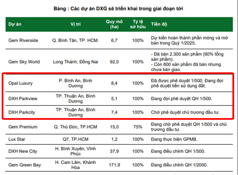 + Mở bán tiếp tại Gem Sky World sau 3 năm ngắt quãng. Với 800 lô đất nền đã bán nhưng chưa bàn giao tại phân khu Sapphire Parkview, DXG sẽ ghi nhận 300-400 lô trong năm 2025. DXG đặt mục tiêu giá bán tại các phân khu còn lại phải cao hơn giá bán đợt mở bán đầu tiên vào năm 2021 (mức 18-25 triệu đồng/m2). Được hỗ trợ tốt bởi một số dự án hạ tầng lân cận tạo tính kết nối vùng như sân bay Long Thành và cao tốc Biên Hòa – Vũng Tàu dần được hoàn thiện.