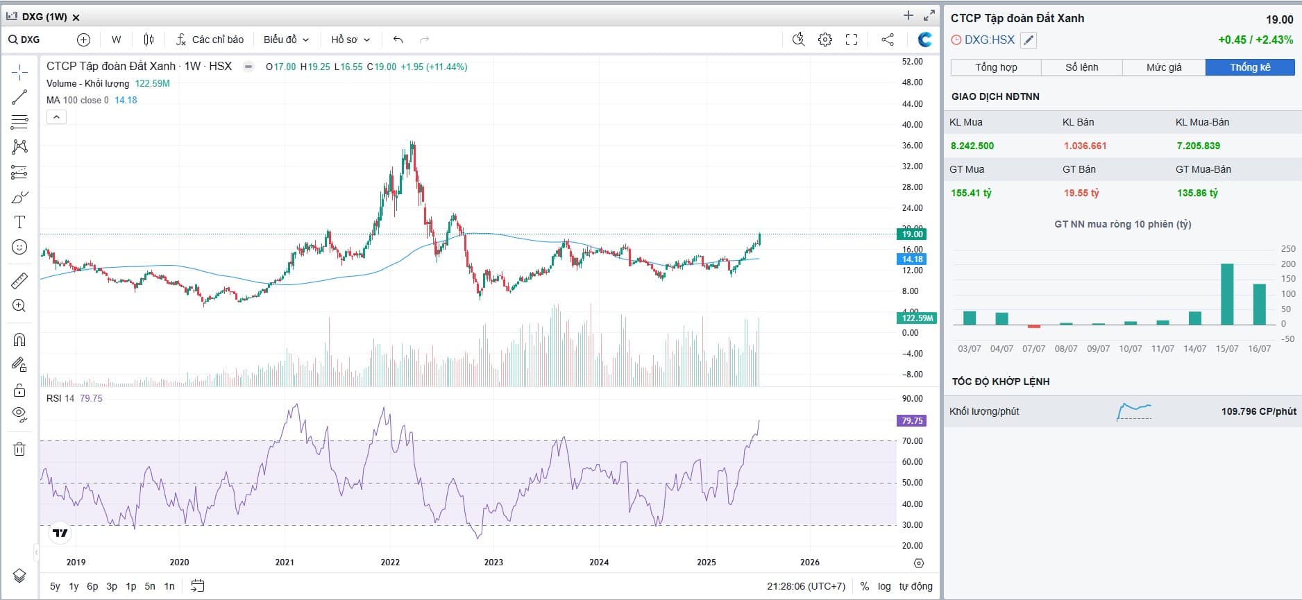 VẬN ĐỘNG: DXG vận động tích lũy kéo dài gần 3 năm, khá giống với thời điểm 2020 khi tích lũy chặt rồi bùng nổ vào trend tăng với sự thúc đẩy của việc mở bán GEM SKY LONG THÀNH