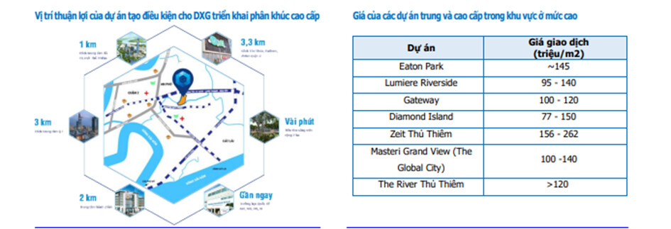 Dự án nằm ở khu Đông TPHCM, cạnh 2 trục đường lớn là Song Hành và đường Mai Chí Thọ - Tiện lợi cho việc di chuyển vào các quận trung tâm và về hướng Đông. Hiện giá bán tại các dự án trong khu vực dao động trung bình quanh mức 100 – 150 triệu/m2. Điều đó tạo điều kiện cho doanh nghiệp mở bán với mức giá cao hơn năm 2018 (dự kiến hơn 100 triệu/m2).