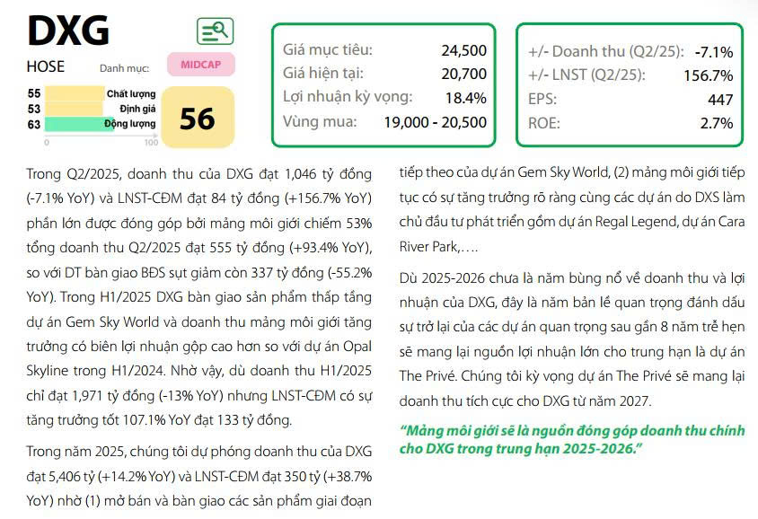 Về kết quả kinh doanh của DXG trong năm 2025, chúng tôi dự đoán sẽ tương đối khả quan. Trong kịch bản cơ sở, doanh thu và lợi nhuận sau thuế của DXG được ước tính đạt 2.068 tỷ đồng, giảm 57% so với năm trước, và lợi nhuận sau thuế cổ đông mẹ đạt khoảng 205 tỷ đồng, tăng 43% so với năm trước. Con số này chủ yếu đến từ việc bàn giao khoảng 700 sản phẩm tại dự án Gem Sky World và doanh thu từ hoạt động môi giới, dự kiến đạt 460 tỷ đồng, tăng 10% so với năm trước.