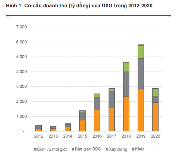 Mô hình kinh doanh của DXG bao gồm hai lĩnh vực chính đem lại doanh thu lớn nhất là Dịch vụ môi giới và Đầu tư phát triển dự án BĐS.
