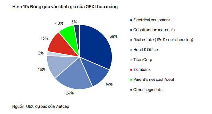 Mở rộng sang lĩnh vực ngân hàng tương ứng yêu cầu phức tạp hơn về mặt quản lý và chiết khấu tập đoàn đa ngành cao hơn: Vào ngày 12/08/2024, GEX đã tăng tỷ lệ sở hữu tại EIB lên 10,0% (ước tính đầu tư 3,3 nghìn tỷ đồng, P/B là 1,43 lần) trở thành cổ đông lớn nhất của EIB. Chúng tôi nâng mức chiết khấu tập đoàn cho GEX do sự phức tạp trong quản lý, chi phí hành chính tăng và đóng góp hạn chế vào lợi nhuận từ EIB do kỳ vọng không có cổ tức bằng tiền mặt trong thời gian tới.