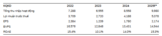 Cho năm 2025, EIB dự kiến đặt kế hoạch LNTT đạt 5,580 tỷ đồng (+33% YoY). Tăng trưởng tín dụng đạt 16.2%, và tổng tài sản đạt 265 nghìn tỷ đồng (+11% YoY).