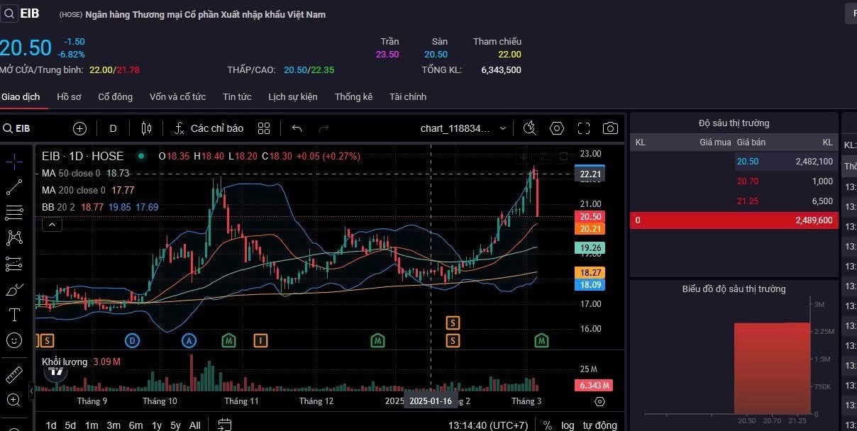 Tuy nhiên, đầu phiên giao dịch chiều 6/3, cổ phiếu EIB xuất hiện những giao dịch “lạ” ở giá sàn với thanh khoản tăng vọt. Nhiều lô với khối lượng hàng trăm nghìn cổ phiếu EIB được khớp ở giá 20.500 đồng/cp (-6,8%). Từ 13h18 trở đi, cổ phiếu EIB bắt đầu hồi trở lại, thu hẹp mức giảm, còn khoảng -4% đến -2%.