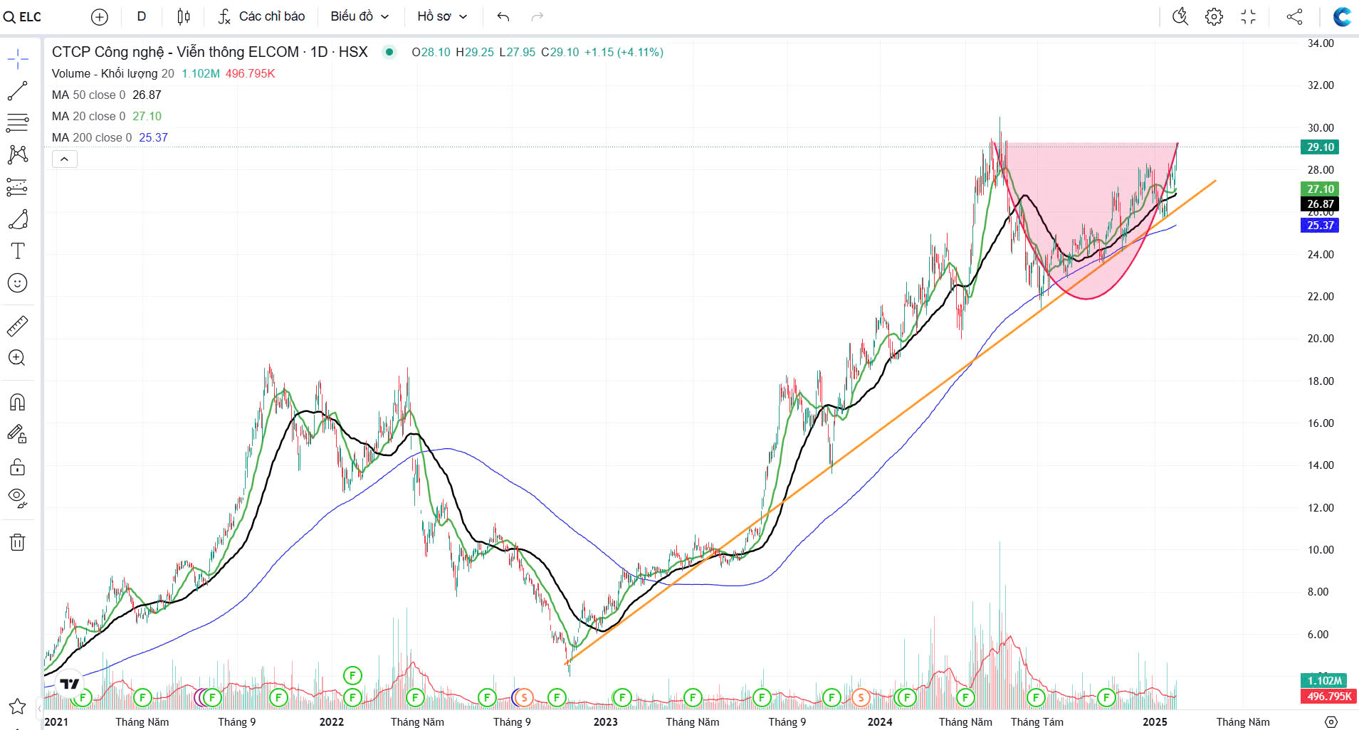 Doanh Nghiệp vẫn đang nằm trong một trend tăng dài từ 2023 đến nay. Giá cổ phiểu đã có sự chậm lại và tích lũy từ tháng 6 đến nay cũng gần 8 tháng, hình thành mẫu hình “Cốc Tay Cầm”. Một mẫu hình khá uy tín cho sự tiếp diễn xu hướng tăng trưởng của Doanh nghiệp. Với vận động giá giai đoạn vừa qua và kỳ vọng của DN trong năm nay, chúng ta có thể kỳ vọng cho một nhịp tăng sắp tới của ELC.
