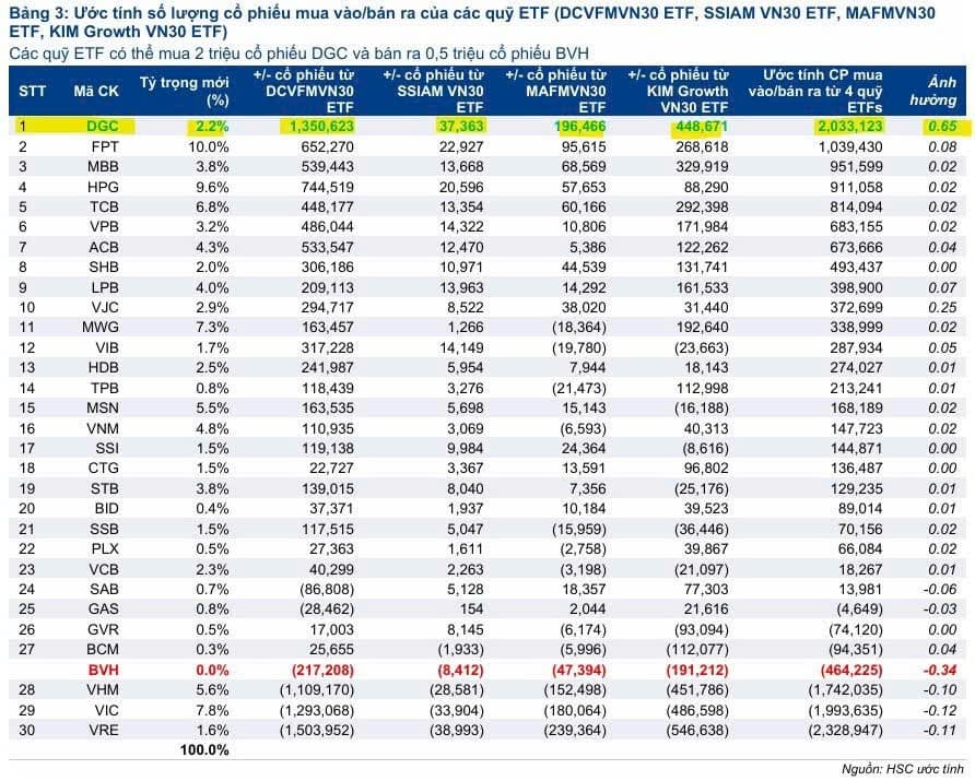 - Ước tính tổng cộng hơn 2 triệu cổ phiếu DGC sẽ được mua vào bởi các quỹ ETF trong kỳ cơ cấu này.