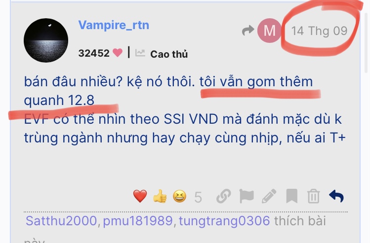 Vam thấy mọi người đánh EVF mà lướt lướt thì đừng hỏi sao giá nó k lên. cái này tui cũng chỉ ngâm cứu vụ PHT 1:1 giá 11 và trao đổi với mọi người còn vụ nhảy tàu T+ lên lên xuống xuống thì chịu các bác phải hỏi lái tàu khi nào tàu chạy chứ. Chiều thứ 5 Vam cũng nói rõ là mua thêm giá 12.8 khi TT chỉnh