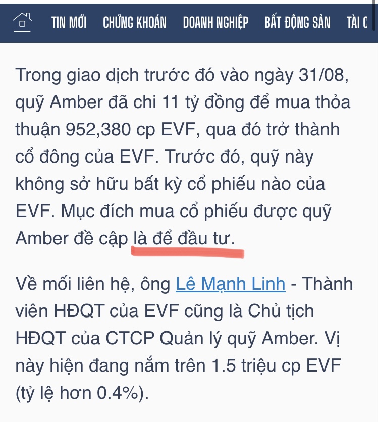 Đọc tin chỉ cần đọc lướt và chú tâm cái quan trọng nhất của tin đó. ví dụ cả đoạn trên chỉ cần quan tâm chỗ tôi gạch đít. 1 Quỹ đầu tư liên quan nội bộ mua EVF để đầu tư giá này thì chúng ta hiểu ngầm giá này là giá đỡ
