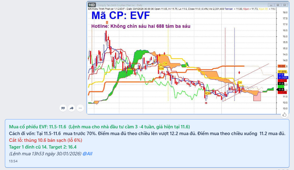 Mua cổ phiếu EVF: 11.5-11.6 (Lệnh mua cho nhà đầu tư cầm 3 -4 tuần, giá hiện tại 11.6)