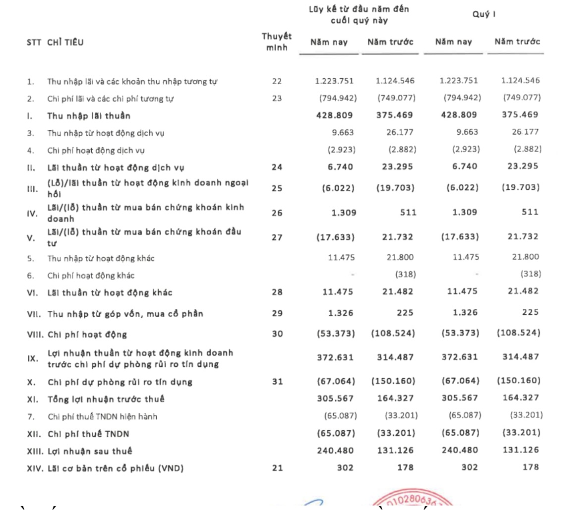 Về kết quả hoạt động, thu nhập lãi thuần tiếp tục là động lực tăng trưởng chính, tăng hơn 14% so với cùng kỳ năm ngoái, đạt 428.809 triệu VND trong Quý I/2025, tăng hơn 53.339 triệu VNĐ so với mức 375.469 triệu VND cùng kỳ năm trước, thể hiện sự hiệu quả trong hoạt động kinh doanh chính của Công ty. Một tín hiệu tích cực là chi phí hoạt động tiếp tục được kiểm soát tối ưu. Chi phí hoạt động giảm xuống còn 53.373 triệu VND, cho thấy Công ty đang nâng cao hiệu quả vận hành. Chi phí dự phòng rủi ro giảm về mức 67.064 triệu đồng, so với mức 150.160 triệu đồng cùng kỳ năm ngoái. Theo đó, lãi cơ bản trên cổ phiếu tănghơn 69% so với cùng kỳ năm ngoái.