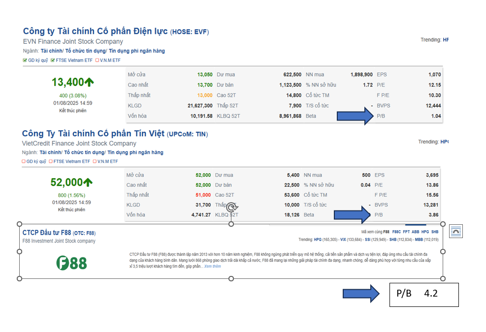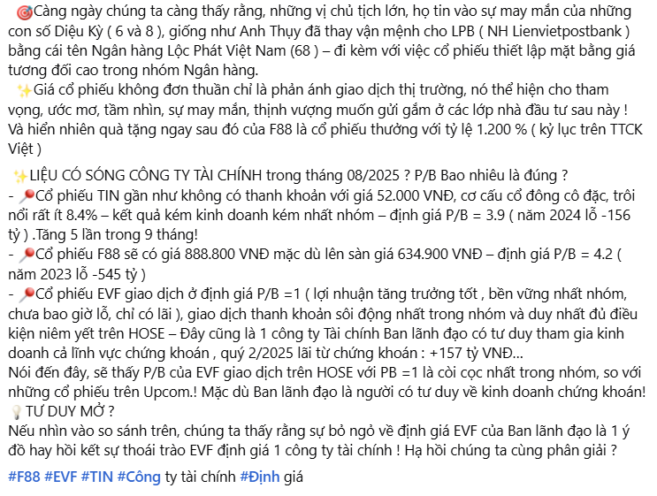 EVF có lợi thế tài chính, nhưng tốc độ tăng trưởng khá chậm. F88 dù tăng trưởng nhanh nhưng đang gánh chi phí khủng và áp lực dư luận. Nói F88 đẹp nhất VN hơi cảm tính.