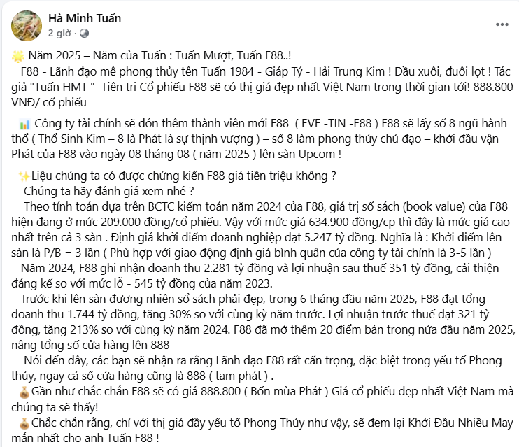 Giá 888.800 nghe giống kiểu chơi số đẹp hơn là phân tích cơ bản. F88 có gì đủ sức bật để x5-x10 trong 1 năm không? Mình thấy vẫn còn quá sớm để khẳng định.