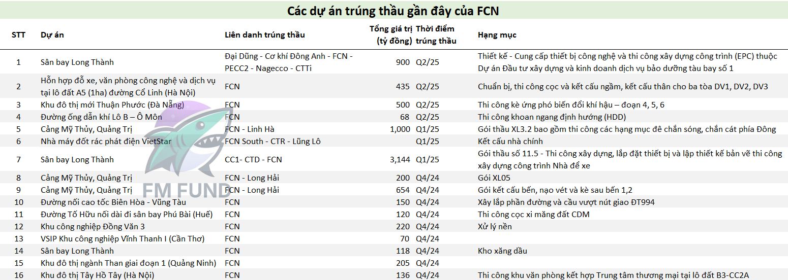 Thực tế, FCN gần đây cũng đã liên tiếp thông báo trúng thầu trong các lĩnh vực kể trên. Trong 6 tháng đầu năm 2025, riêng giá trị các gói thầu mà FCN đảm nhận đã đạt hơn 3.500 tỷ đồng (chi tiết xem tại ảnh 2). Bên cạnh giá trị backlog chuyển tiếp từ năm 2024, doanh thu xây lắp đã được đảm bảo sẽ tăng trưởng mạnh trong năm 2025-26. Chúng tôi cũng lưu ý rằng, doanh thu mảng này của FCN trong năm 2023-24 chỉ là 2.060 – 2.980 tỷ đồng.