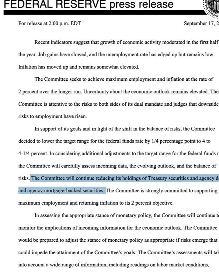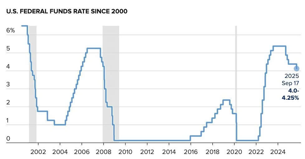 Ngày 17/9/2025, Fed quyết định giảm lãi suất điều hành 0,25% xuống 4%–4,25%, nhằm hỗ trợ tăng trưởng kinh tế khi các chỉ báo việc làm, sản xuất cho thấy dấu hiệu chậm lại. Tuy nhiên, Fed vẫn duy trì chính sách thắt chặt định lượng (QT), tiếp tục bán ra trái phiếu Kho bạc và chứng khoán thế chấp để hút tiền về, giữ kỷ luật tài khóa – tiền tệ.