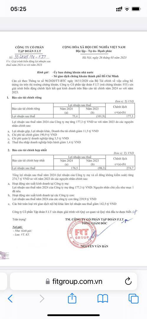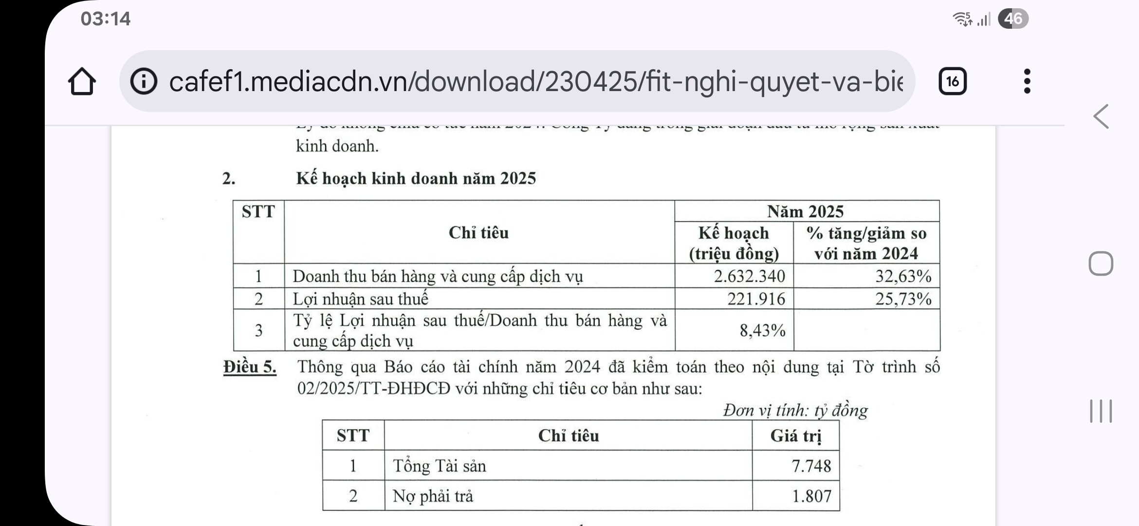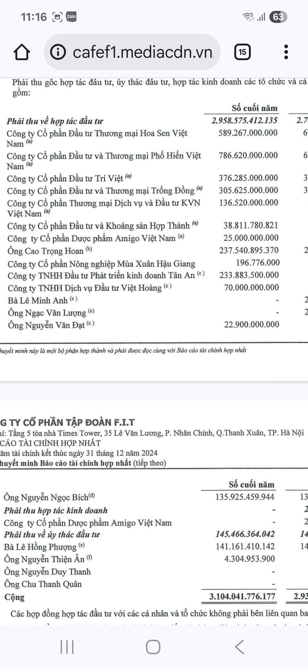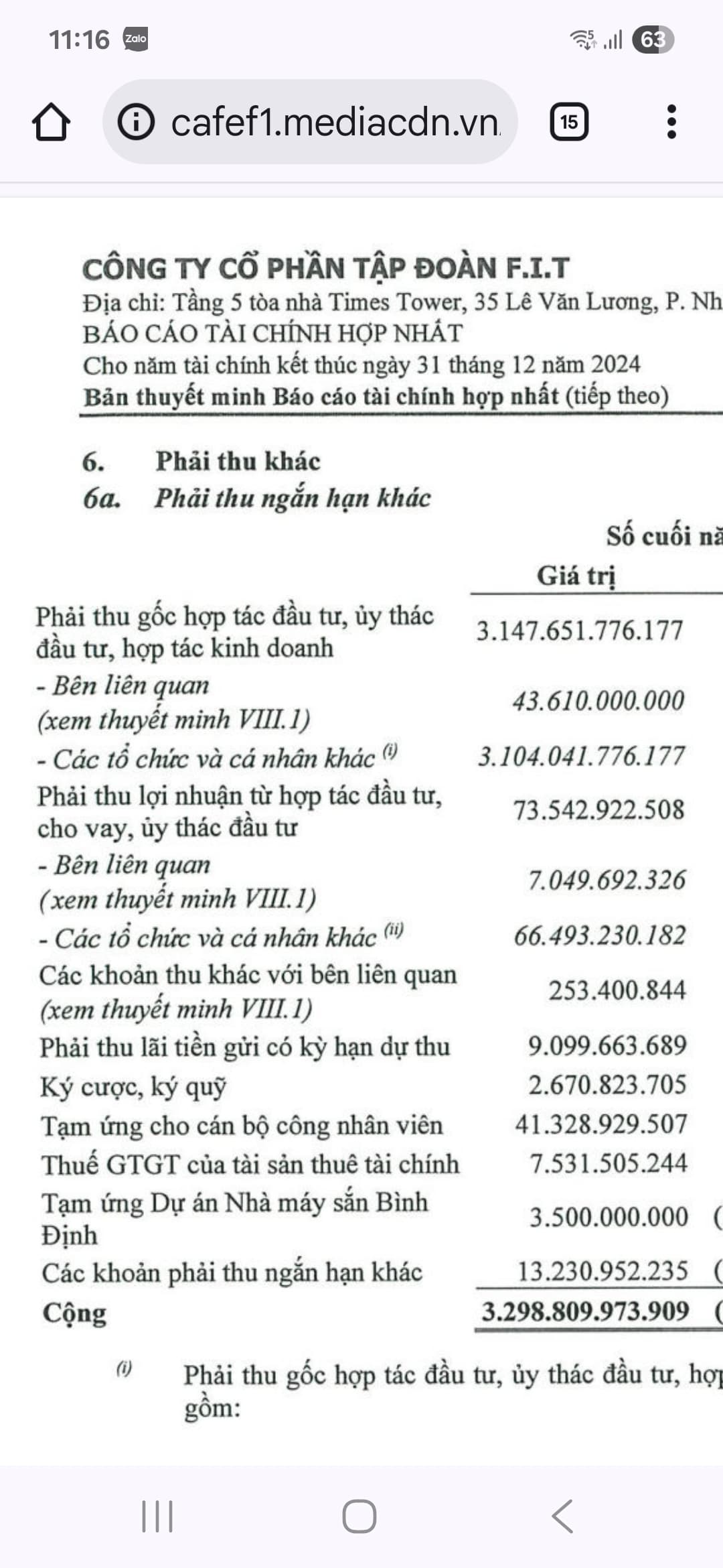 Bctc hợp nhất 2024 kiểm toán có ghi chi tiết các công ty đối tác mà fit hợp tác đầu tư, hầu hết là đầu tư kd bđs, nếu tính theo chu kỳ kd 1 dự án bđs khoảng 2,3 năm thì khả năng cuối năm nay fit có thể gặt hái thành quả, có thể là 1 con số ln đột biến.