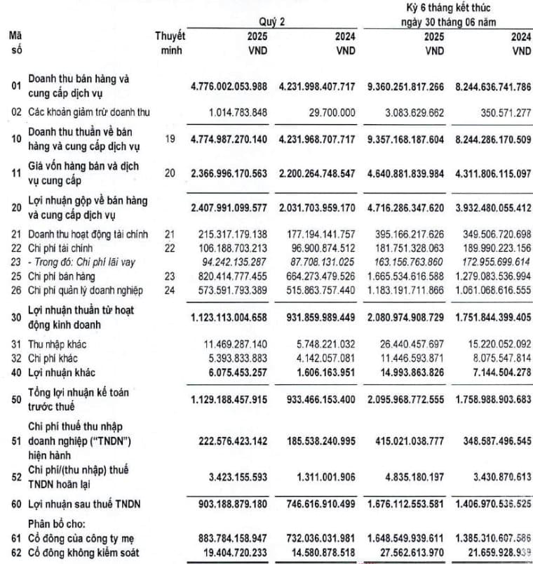 Công ty Cổ phần Viễn thông FPT đã công bố BCTC hợp nhất quý 2/2025, ghi nhận doanh thu thuần trong kỳ này tăng 13% so với cùng kỳ năm trước, lên mức 4.775 tỷ đồng. Giá vốn tăng chậm hơn giúp biên lãi gộp cải thiện lên 50%, tương đương lãi gộp 2.408 tỷ.