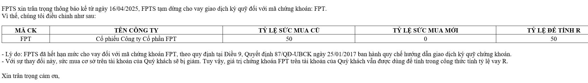 Thông báo đầy đủ là FPTS đã full room margin FPT nên không có cấp thêm sức mua mới được còn các deal cho vay cũ vẫn giữ nguyên