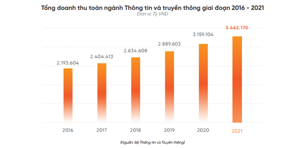 Theo đó, dù chịu ảnh hưởng của nhiều làn sóng dịch Covid-19 liên tiếp, kinh tế Việt Nam nói chung và ngành công nghệ thông tin vẫn đạt được những thành tựu đáng kể. Theo số liệu từ Bộ Thông tin và Truyền thông, tổng doanh thu toàn ngành năm 2021 đạt 3.462.170 tỷ đồng, tăng 9,6% so với năm trước.