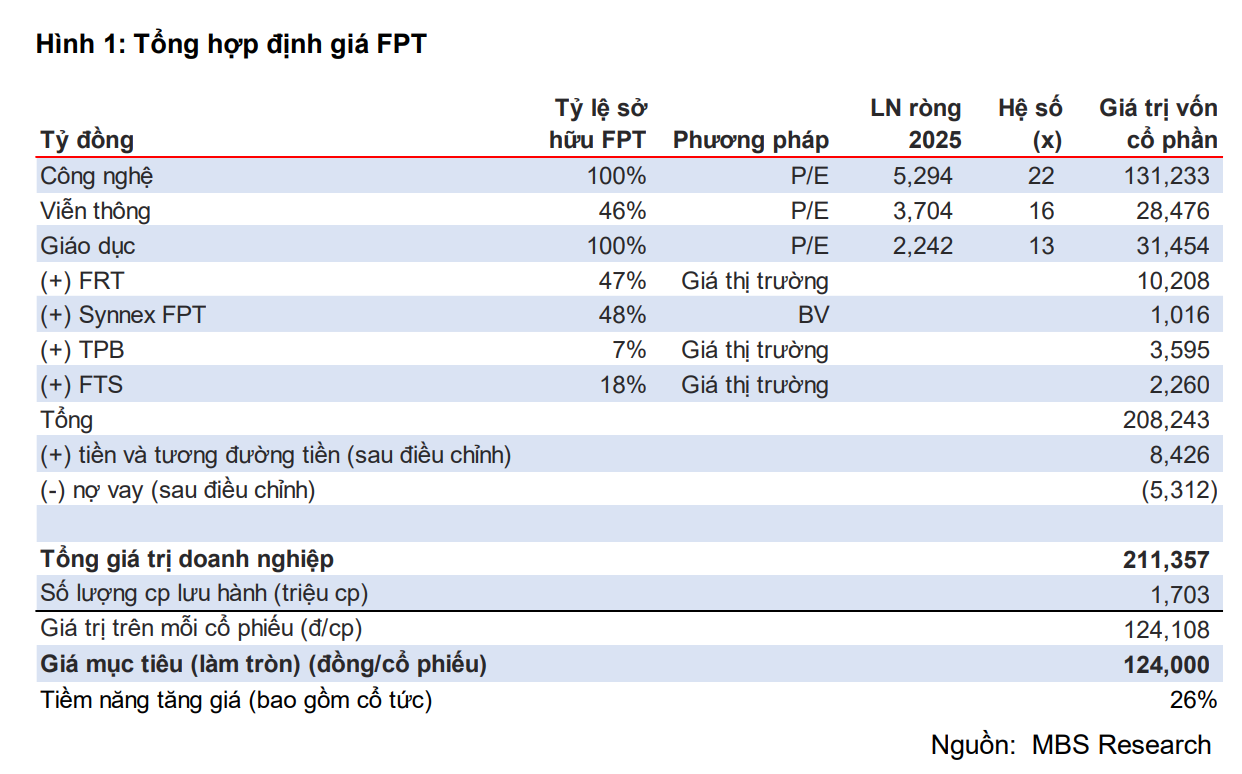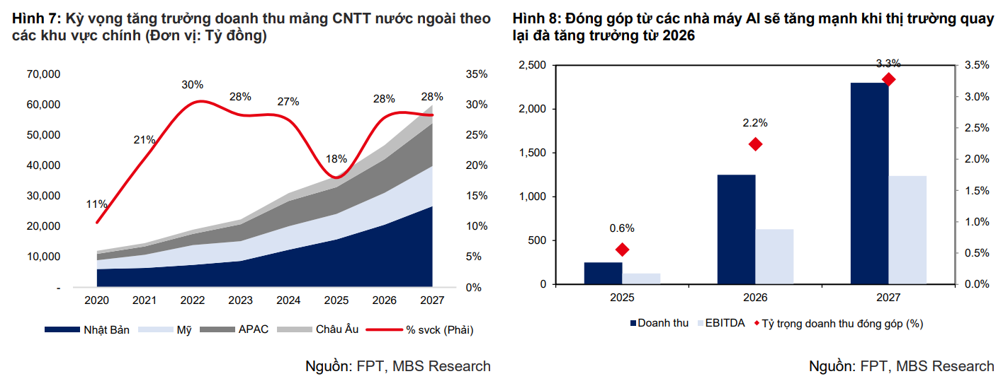 Doanh thu mảng công nghệ kỳ vọng dần phục hồi từ 2026 duy trì tăng trưởng kép 25% GĐ 2025-27, nhờ (1) Chi tiêu CNTT toàn cầu dự kiến tiếp tục tăng trong trung hạn, đặc biệt chi tiêu cho chuyển đổi số sẽ duy trì tốc độ tăng trưởng kép cao 16.2% giai đoạn 2022-27; (2) Chiến lược đa dạng hóa thị trường như EU, Trung Đông thông qua M&A kỳ vọng giúp doanh nghiệp khai thác thêm được nhiều hợp đồng quy mô lớn; (3) Hai nhà máy AI dự kiến bắt đầu đóng góp ~1,250 tỷ đồng doanh thu (~2.2% mảng) trong 2026, sau đó kỳ vọng tiếp tục duy trì tăng trưởng 30-50% trong các năm tới; (4) Trong nước, triển vọng lớn đến từ các hoạt động chuyển đổi số cho các địa phương sau khi sát nhập, xu hướng chuyển đổi số chung của các doanh nghiệp cũng sẽ dần phổ biến theo xu thế thế giới.