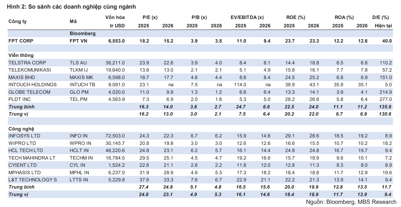 Sau đợt chiết khấu sâu của thị trường, FPT hiện đang giao dịch ở mức P/E ~19.5x, thấp hơn nhiều so với P/E trung bình 2 năm là 23.4x. Đây cũng là mức thấp hơn nếu so sánh với các đối thủ công nghệ tại Ấn Độ (trung bình P/E ~24x). Chúng tôi cho rằng ở hiện tại, FPT có mức định giá giá đủ hấp dẫn cho mục tiêu đầu tư dài hạn, các khó khăn của 2025 phần nào đã được phản ánh vào giá và kỳ vọng LN sẽ cải thiện từ 2026 với kỳ vọng tăng trưởng kép LN ròng 20% GĐ 2025-27.