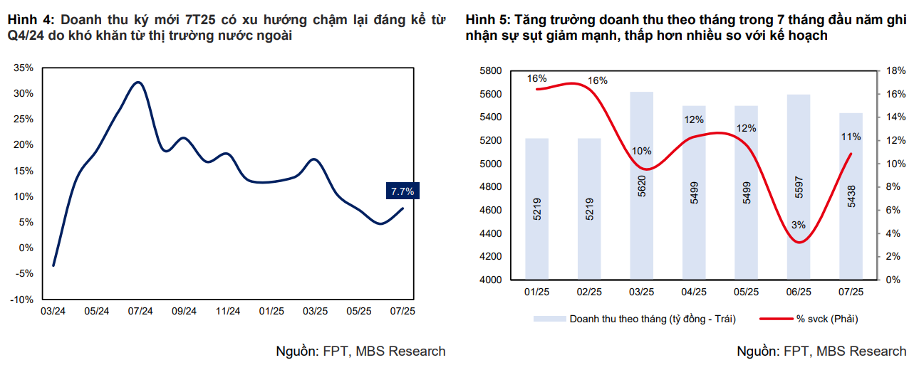 Khó khăn chính đến từ thị trường CNTT nước ngoài, trong đó, chúng tôi kỳ vọng mức tăng trưởng chậm lại đáng kể ở các thị trường Mỹ (+8.4% svck) và APAC (+6.4% svck) trong khi thị trường Nhật Bản sẽ vẫn là bệ đỡ với tăng trưởng 27% svck trong 2025. Chúng tôi nhận thấy một số tín hiệu tích cực từ lượng doanh thu ký mới phục hồi trong tháng 7/25 đạt 27% svck, cho thấy tâm lý tích cực hơn của khách hàng trong bối cảnh các kết luận về thuế quan dần được định hình. Ở thị trường trong nước, FPT kỳ vọng việc nhiều gói dự án chuyển đổi số lớn cho các địa phương, đặc biệt quan trọng sau khi sát nhập tỉnh thành, theo đó, tăng trưởng có thể phục hồi từ 2026.