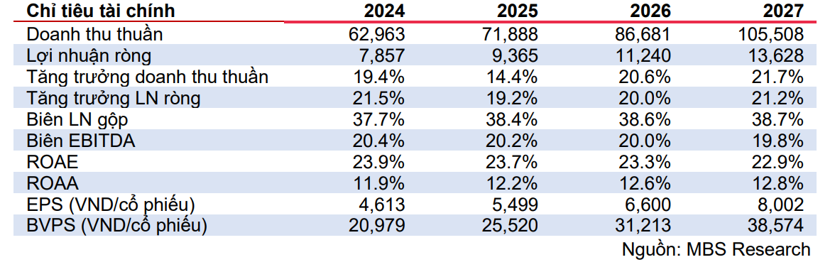 Trong 2025-27, kỳ vọng lượng học viên mới tăng 30%/năm, nhờ tiếp tục đẩy mạnh đầu tư mở rộng nhanh mạng lưới các trường K-12 tích hợp tại nhiều tỉnh thành, cộng với triển khai thêm các chương trình đào tạo mới về ngành bán dẫn, AI, ô tô sẽ là bàn đạp thúc đẩy tăng trưởng học viên mới theo học các chương trình của FPT. Doanh thu/học viên dự kiến duy trì ở mức ổn định trong các giai đoạn đầu.