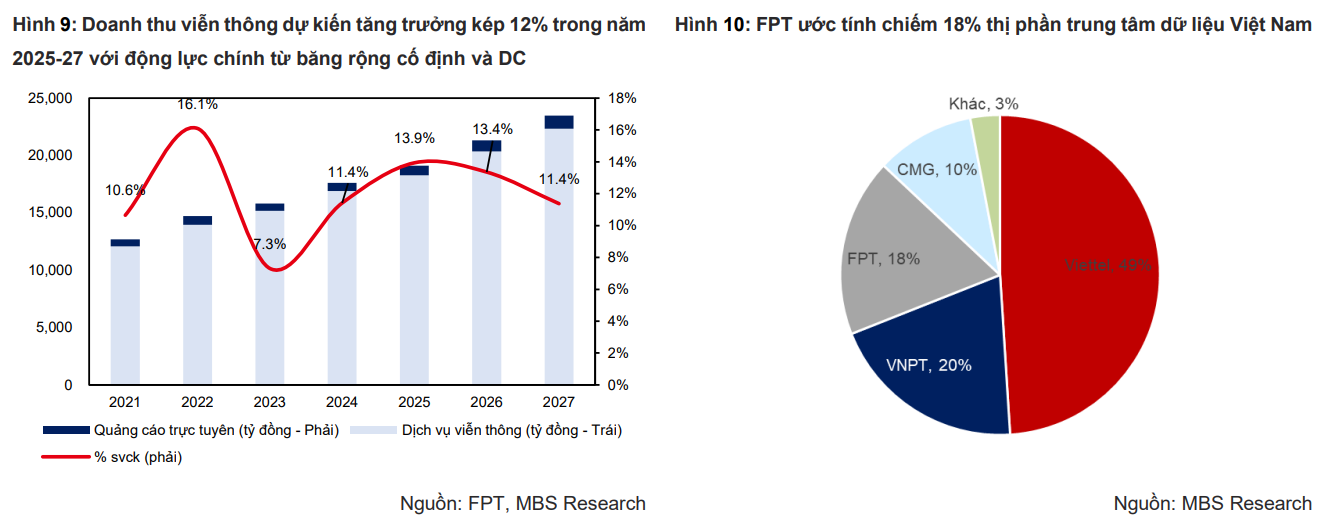 Doanh thu viễn thông dự báo tăng trưởng kép 13% giai đoạn 2025-27 nhờ hoạt động cung cấp băng rộng cố định (broadband) duy trì tích cực. Hơn nữa, động lực tăng trưởng đến từ mảng Trung tâm Dữ liệu (DC) nhờ nhu cầu ngày càng cao về AI và Cloud; Năng lực cho thuê cải thiện khi FPT Fornix HCM02 – trung tâm dự liệu lớn nhất của FPT đi vào hoạt động nâng tổng số tủ rack lên thêm gấp đôi đạt hơn 7000 tủ. Ngoài ra, việc chuyển cổ phần của SCIC về Bộ Công An kỳ vọng giúp FPT Telecom mở rộng không gian phát triển, như tiếp cận được nguồn việc về xử lý dữ liệu hành chính công, thực hiện các dự án quy mô lớn của nhà nước trong mảng viễn thông và an ninh mạng.