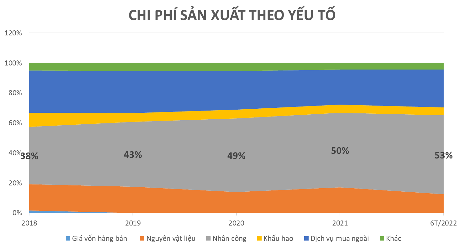 Chi phí nhân công của FPT gia tăng qua từng năm từ 38% tổng chi phí sản xuất theo yếu tố năm 2018 tăng lên 53% nửa đầu năm 2022. Chí phí nhân công cho thấy việc mở rộng hoạt động kinh doanh của doanh nghiệp ở cả ba mảng kinh doanh cốt lõi. Đồng thời, với tỷ trọng lớn, chi phí nhân công ảnh hưởng lớn đến kết quả kinh doanh của FPT, nếu kiểm soát tốt khoản mục này FPT sẽ có lợi thế cạnh tranh về giá với các đối thủ cạnh tranh trên toàn cầu. Đặc biệt khi mảng CNTT là mảng trọng yếu của FPT, chi phí nhân công chiếm đến 65% tổng chi phí mảng CNTT.