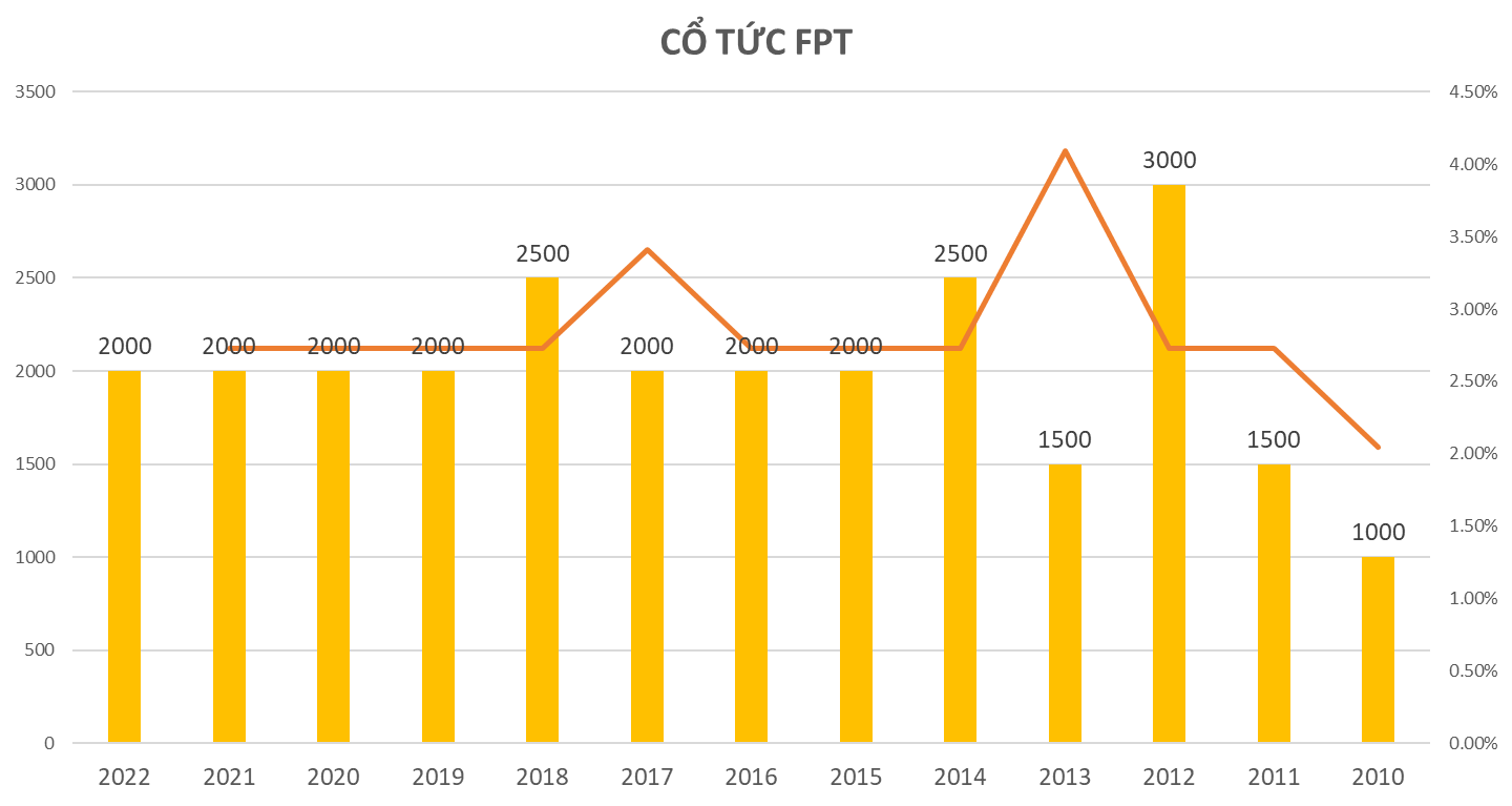 Ngoài ra, FPT một năm còn tiến hành trả cổ tức hai đợt bằng 20% mệnh giá, cũng là một yếu tố thể hiện sự quan tâm của BLĐ với cổ đông. Trong bối cảnh thị trường chứng khoán khó khăn như hiện tại thì việc có dòng tiền từ cổ tức là điều đáng chú ý và nhà đầu tư có thể tận dụng để tiếp tục tái đầu tư khoản tiền này.